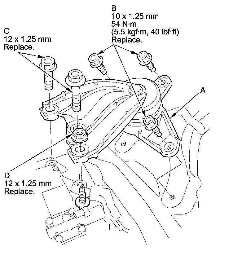 51. Loosely install new upper transmission mount bracket bolts (C) and nut (D) to the transmission housing.
