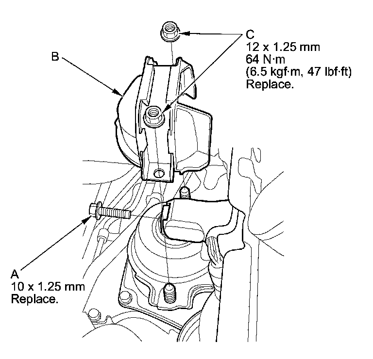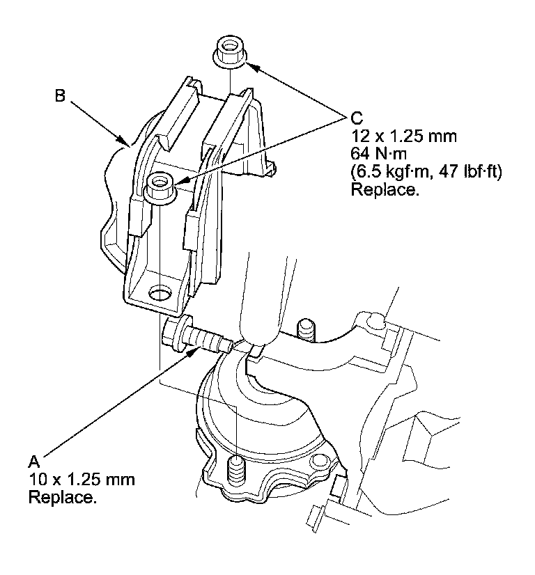 52. Loosely install a new rear engine mount bolt (A), then install the rear engine mount stop (B) with new nuts (C).