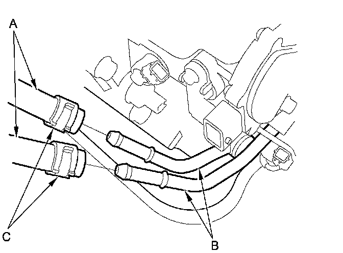 64. Connect the ATF cooler hoses (A) to the ATF cooler lines (B), and secure the hoses with the clips (C) Service and Repair.