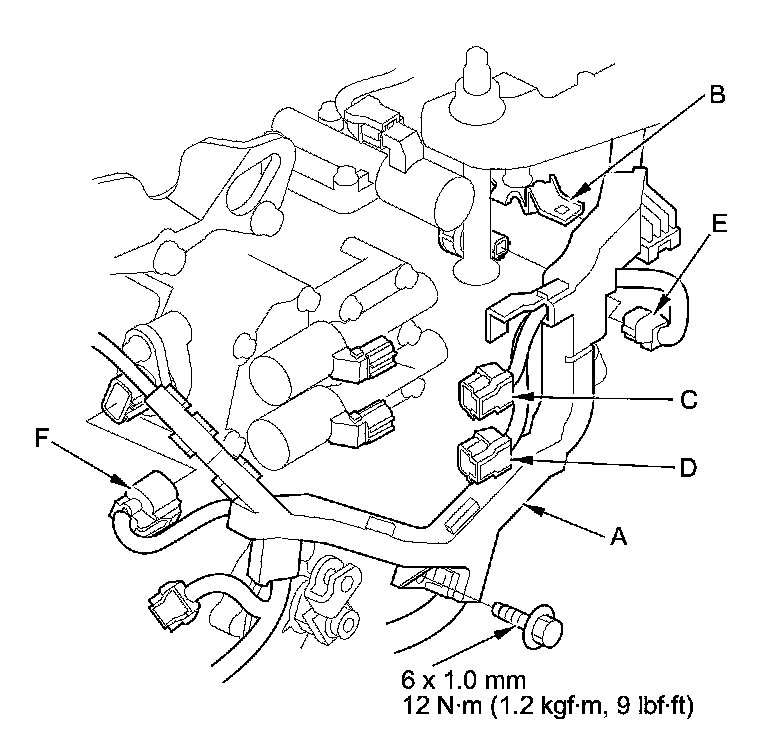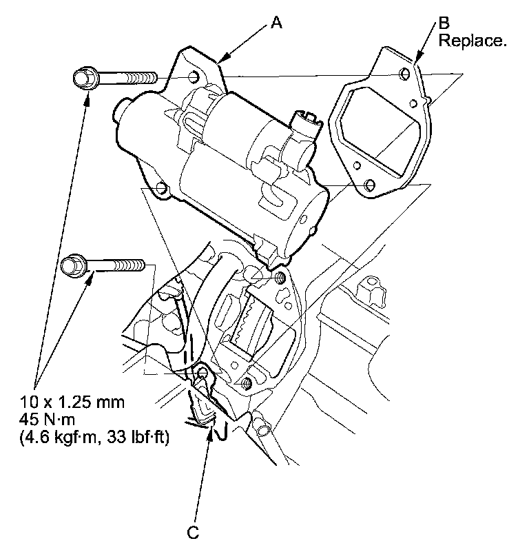 77. Remove the ATF dipstick, then install the starter (A), a new gasket (B), and the harness clamp bracket (C).