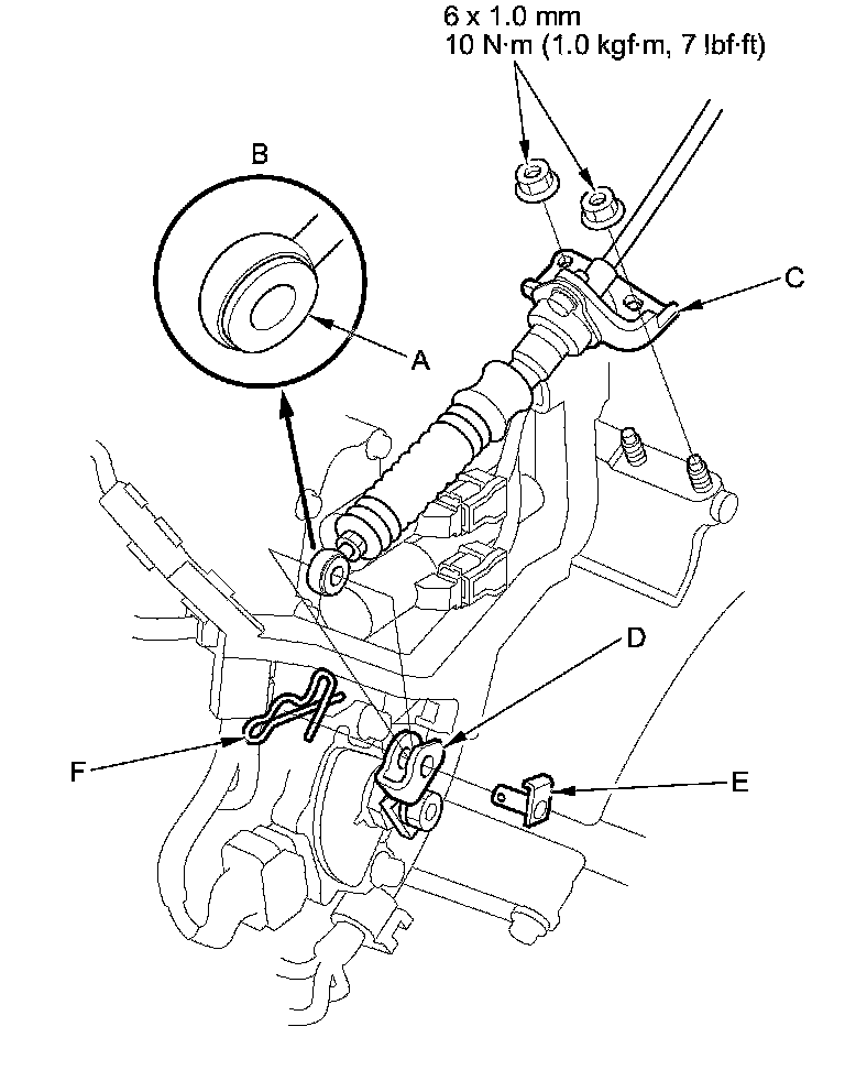 75. Apply molybdenum grease to the hole in the bushing (A) in the shift cable end (B), then install the shift cable bracket (C) with the nuts.