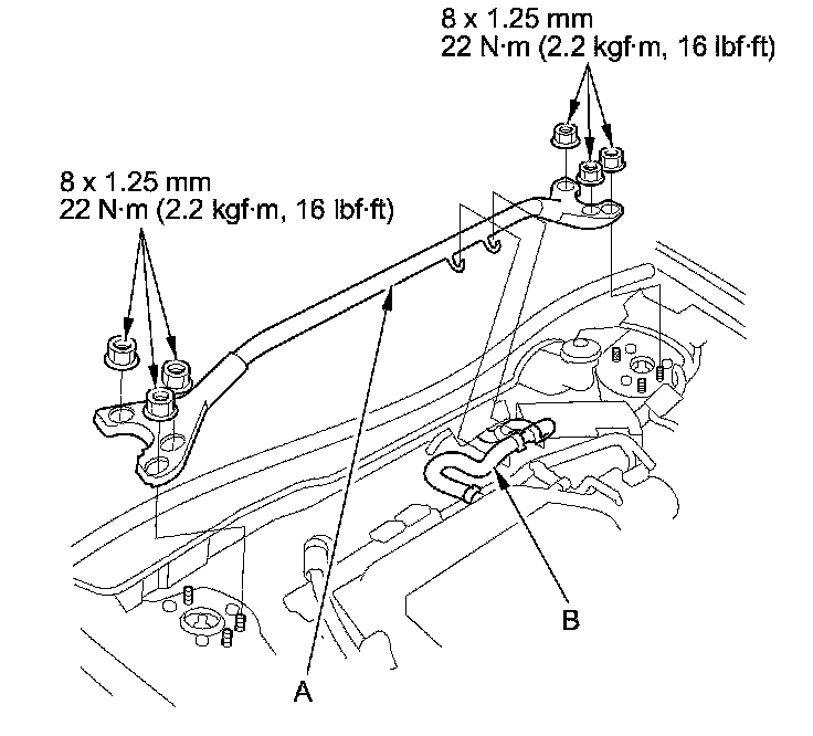 82. Install the strut brace (A), then install the brake booster vacuum hose (B) onto the strut brace.