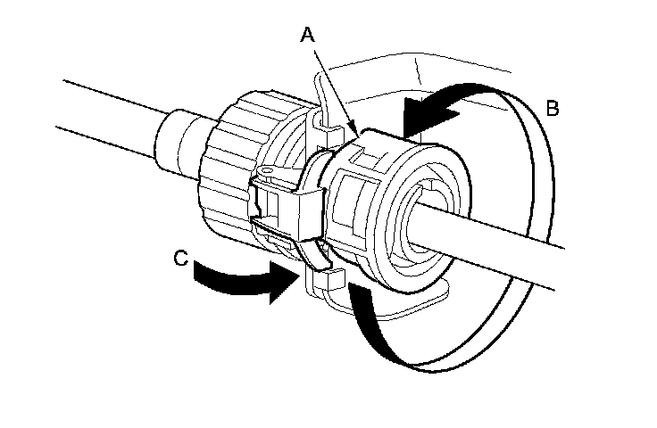 5. Rotate the socket holder retainer (A) counterclockwise (B) until it stops, and push the retainer lock (C) into the socket holder retainer to lock the retainer.