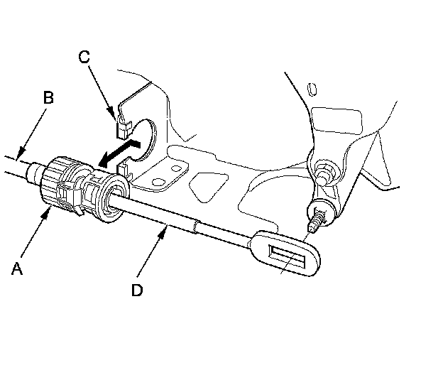 6. Slide the socket holder (A) away from the bracket as shown to remove the shift cable (B) from the shift cable bracket (C). Do not remove the shift cable by pulling the shift cable guide (D).
