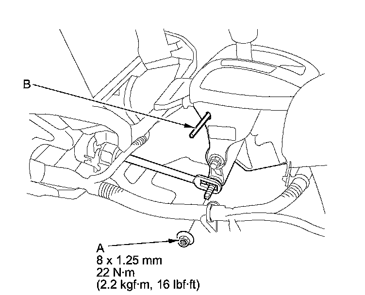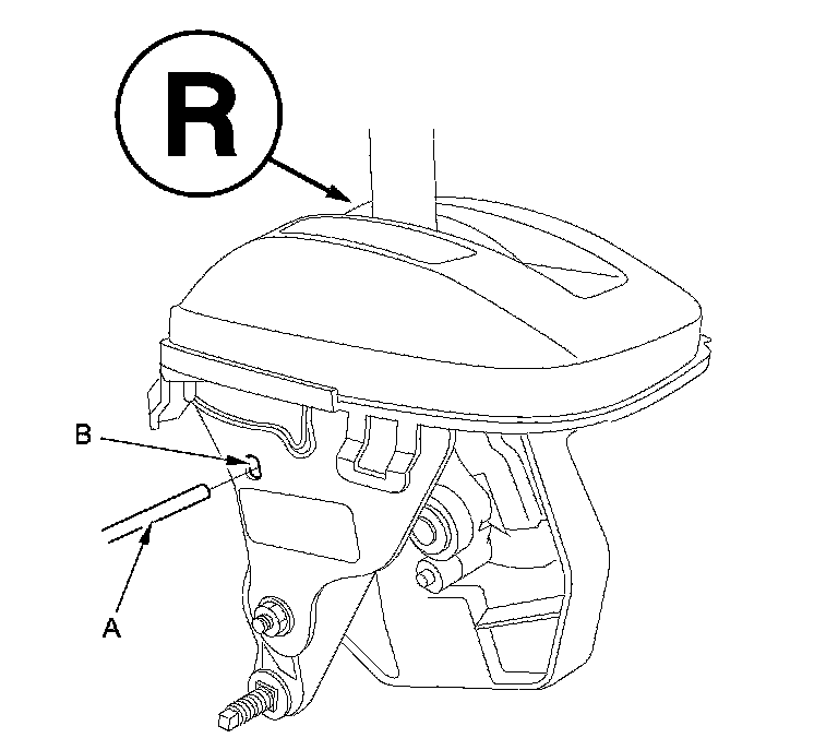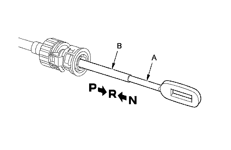 8. If necessary, push the shift cable (A) until it stops, then release it. Pull the shift cable back one step so that the shift position is in R. Do not hold the shift cable guide (B) to adjust the shift cable.