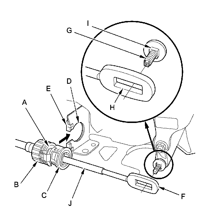 11. Align the shift cable slot (A) between the socket holder (B) and the socket holder retainer (C) with the opening (D) in the shift cable bracket (E), then slide the holder into the bracket while installing the shift cable end (F) over the mounting stud (G) by aligning its square hole (H) with the square fitting (I) at the bottom of the stud. Do not install the shift cable by holding the shift cable guide (J).