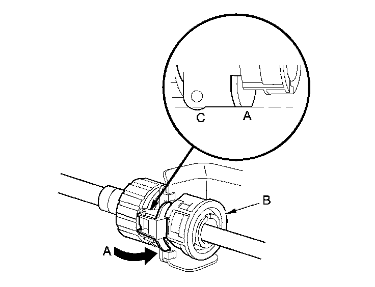 12. Push the retainer lock (A) fully to lock the socket holder retainer (B), and make sure that the retainer lock fits into the hinged-joint (C). If the retainer lock does not fit with the edge of the hinged-joint, rotate the holder retainer counterclockwise while pushing the retainer lock until it locks.