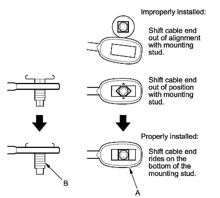 13. Make sure the shift cable end (A) is properly installed on the mounting stud (B).