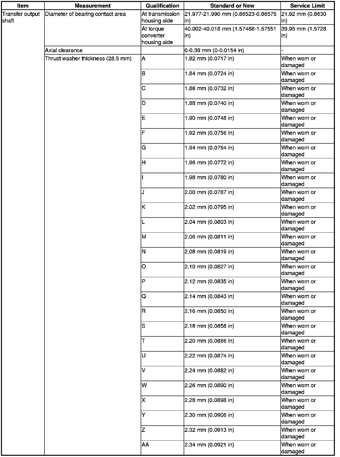Transfer Output Shaft Specification(s)