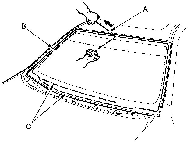 13. Attach rubber dam B with the adhesive tape to the inside surface of the windshield (A) as shown, using the edge of the black ceramic-coated area (C) as a guide: