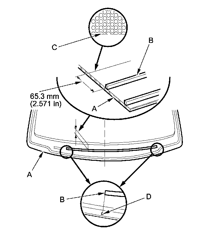 12. Apply glass primer to the upper clips mounting area on the windshield (B), and let it dry. Remove the adhesive backing and attach rubber dam A and the upper clips (C) to the inside of the windshield as shown: