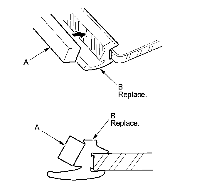2. Remove the windshield molding (A) from the upper edge of the windshield (B). If necessary, cut the windshield molding with a utility knife.