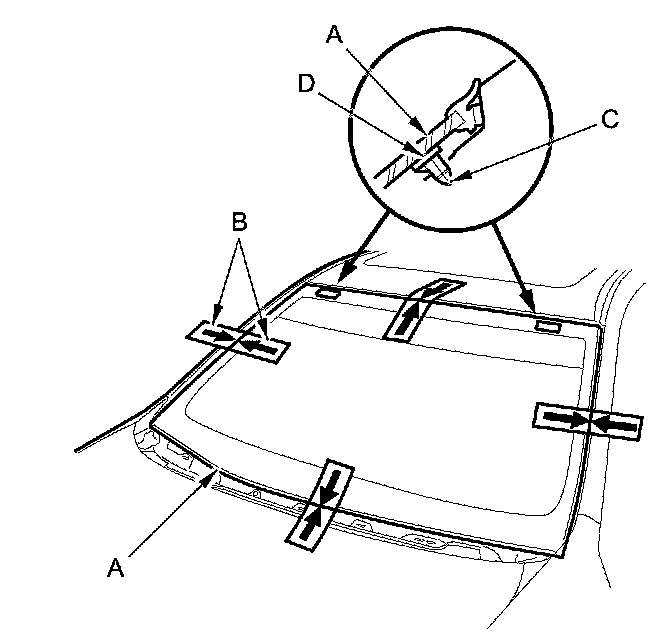 21. Put the cartridge in a caulking gun, and run a continuous bead of the adhesive (A) around the windshield (B) along the edge of the windshield molding (C) and the rubber dams (D) as shown: