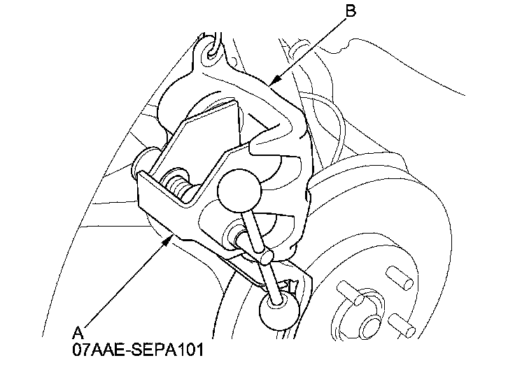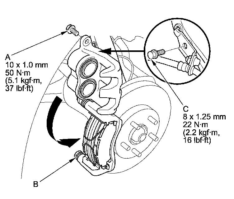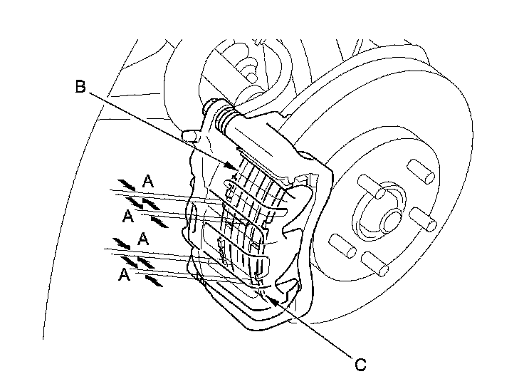 Verify that the caliper pins (C) move in and out smoothly. Clean and lube if needed.
