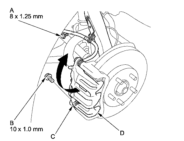 5. Remove the flange bolt (B) while holding the caliper pin (C) with a wrench. Be careful not to damage the pin boot, and pivot the caliper body (D) up out of the way. Check the hose and the pin boots for damage and deterioration.