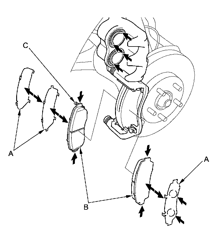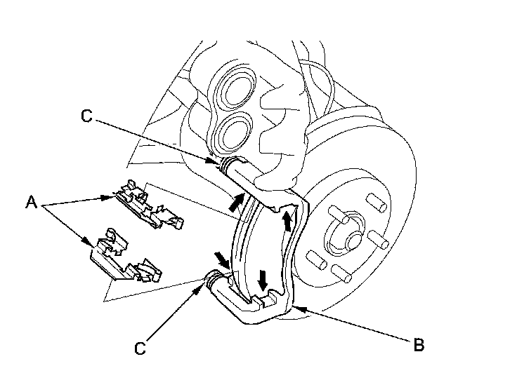 17. Install the brake pads and the pad shims correctly. Install the brake pad with the wear indicator (C) on the upper inside position. If you are reusing the brake pads, always reinstall the brake pads in their original positions to prevent a temporary loss of braking efficiency.