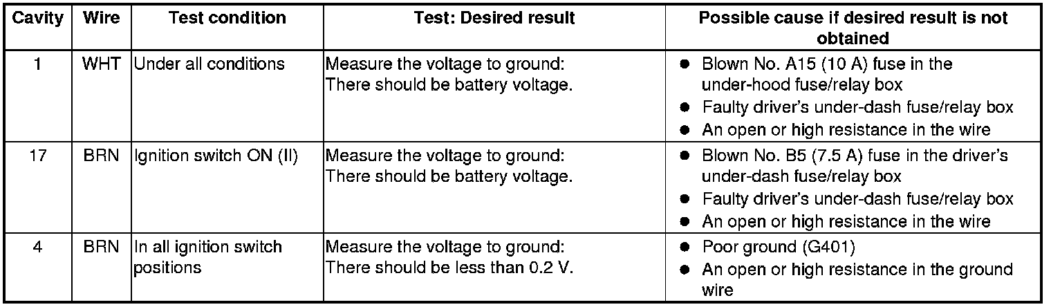 5. Reconnect the connectors to the driver's under-dash fuse/relay box, and do the following input tests: