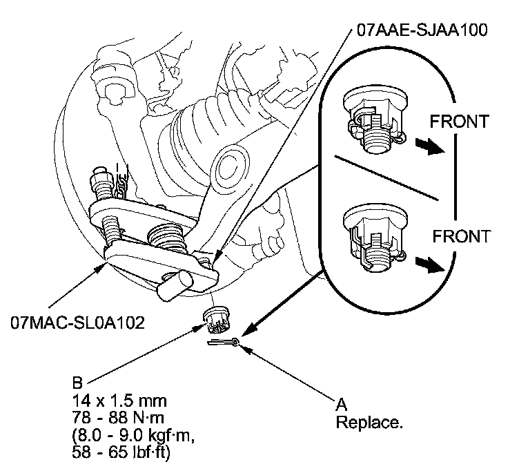 5. Remove the cotter pin (A) from the knuckle ball joint, then remove the castle nut (B).