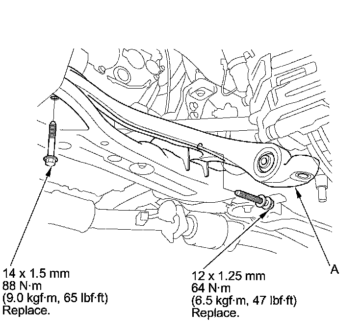 7. Remove the lower arm mounting bolts, and remove the lower arm (A).