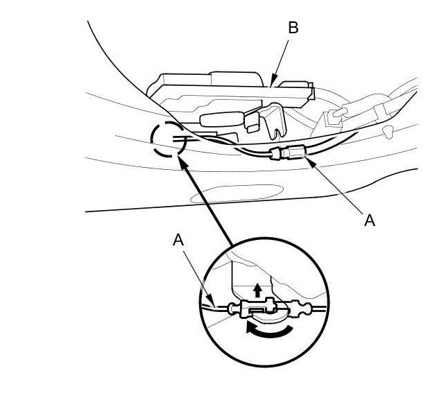 2. Disconnect the tailgate opener cable (A) from the tailgate latch (B). Take care not to kink the cable.