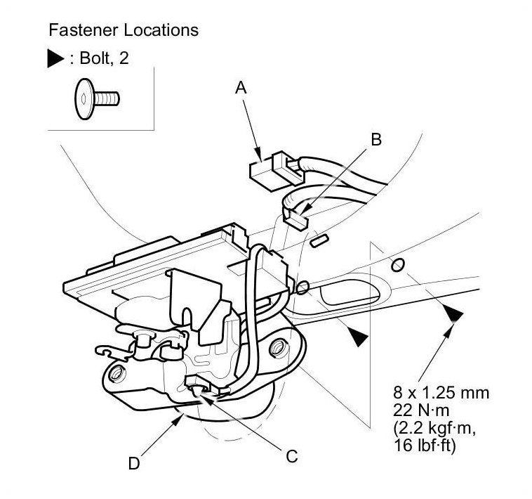 5. Remove the bolts, then pull out the tailgate latch (D) from the tailgate.