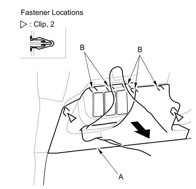 1. Pull the fuse access panel (A) back by hand to release the hooks (B) and the clips.