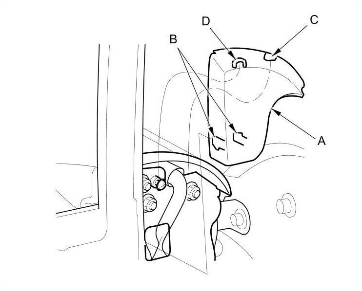 1. Carefully pull the bottom edge of the mirror mount cover (A) out to release the lower hooks (B), and remove the cover by lifting it upward to release the upper hooks (C, D).