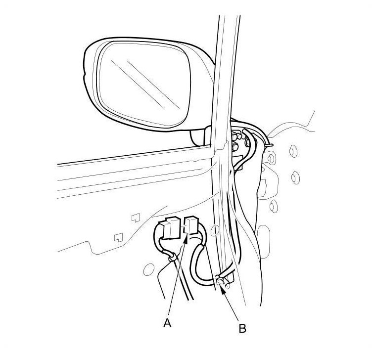 6. Remove the mirror (A) by pulling the threaded studs (B), the screw (C), and the wire harness (D) out through the holes in the door. Take care not to scratch the door or the mirror.
