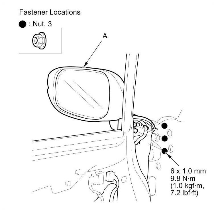 5. While holding the mirror (A), remove the nuts.