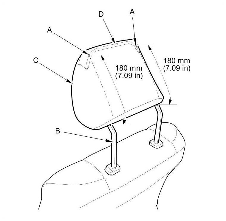 3. Make marks (A) on both sides at 180 mm (7.09 in) upward from the roots of the head restraint frame (B) along the back of the head restraint (C) surface. Mark the center of these points as a datum point (D).
