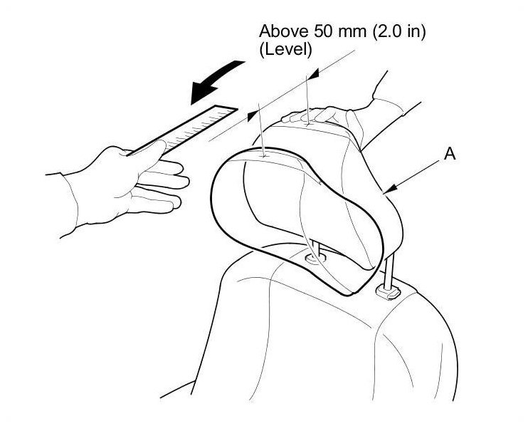 4. Push the head restraint (A) forward, and measure the level amount of the head restraint movement. The head restraint should move more than 50 mm(2.0 in) without resistance. If it is less than 50 mm (2.0 in), or the head restraint doesn't move smoothly, replace the seat-back frame: