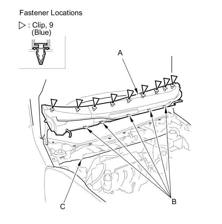 1. Install all of the front hooks (A) on the edge of the under-cowl panel (B), and fit the clips into the holes on the body, then push on the cowl cover (C) until the clips snap into place securely.