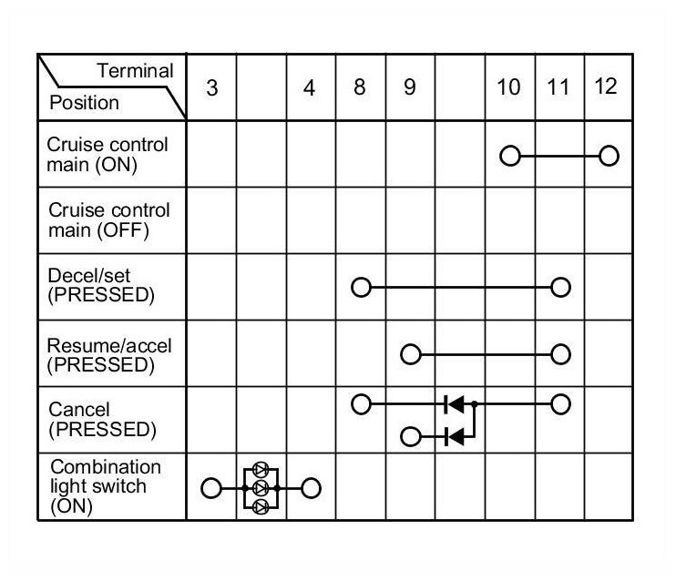 3. Check for continuity between the terminals in each cruise control combination switch position according to the table: