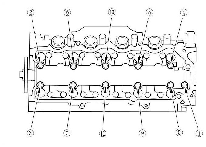 3. Unscrew the rocker shaft mounting bolts two turns at a time in the sequence shown.