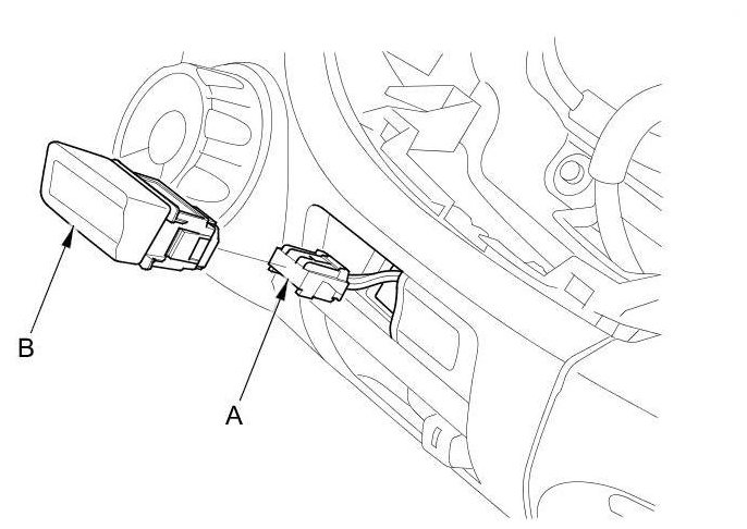2. Disconnect the 5P connector (A), and push the A/C switch (B) out from behind the heater control panel.