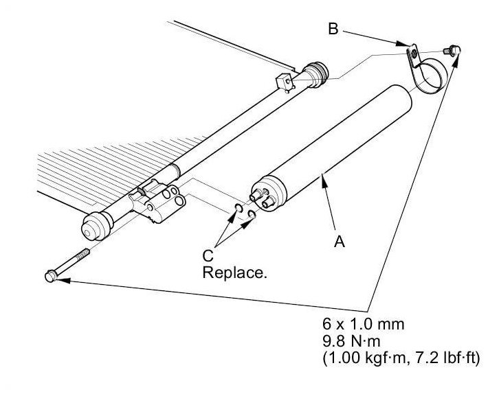2. Remove the bolts from the A/C condenser, then remove the receiver/dryer (A), the bracket (B), and the O-rings (C).