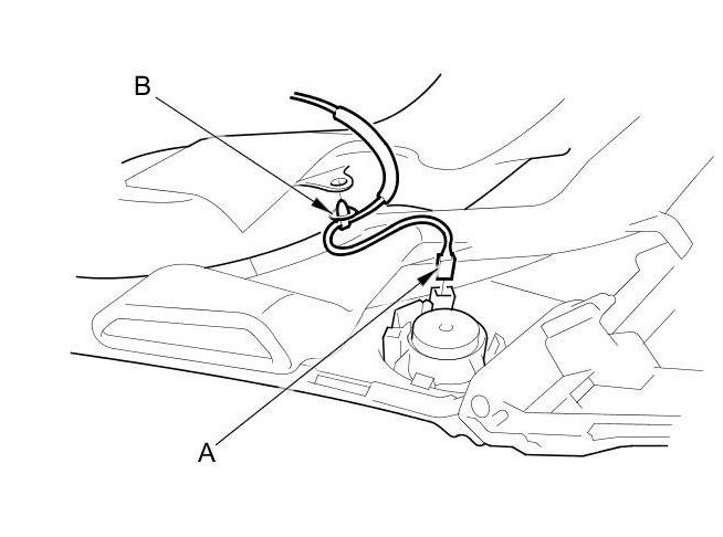 4. On the back of both sides of the dashboard, disconnect the tweeter connectors (A), then detach the harness clips (B) from both sides. The driver's side is shown; the passenger's side is similar.