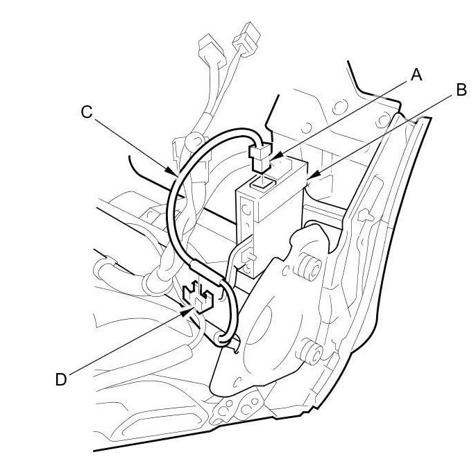 5. With navigation system ('9-11 models): On the back of the passenger's side of the dashboard, disconnect the USB subharness connector (A) from the USB adapter unit (B), then release the USB subharness (C) from the harness clip (D).