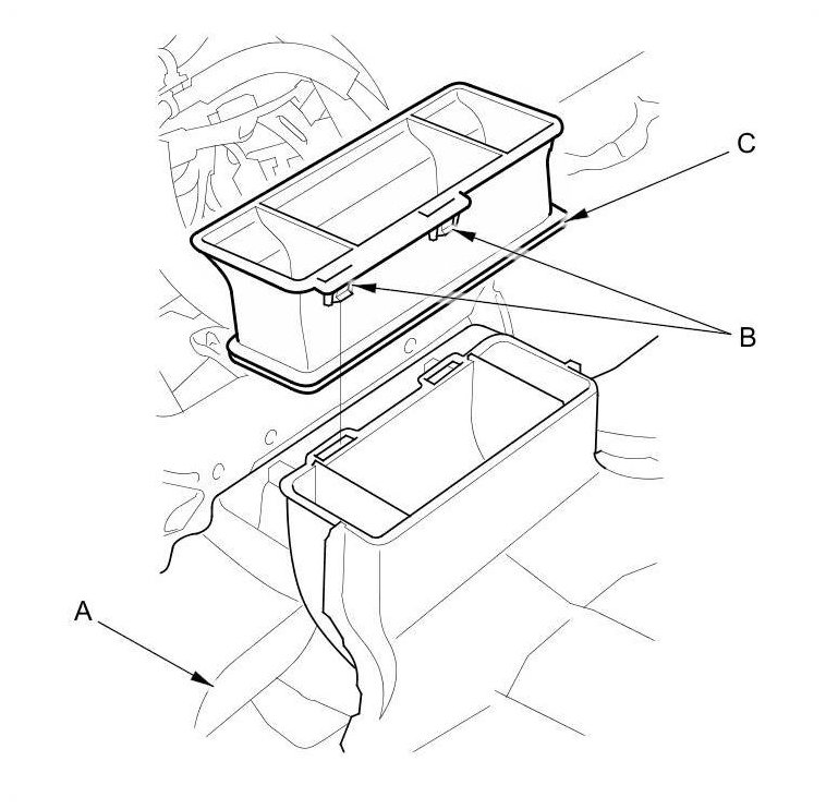 7. From the back of the dashboard (A), release the hooks (B), and remove the center joint duct (C).