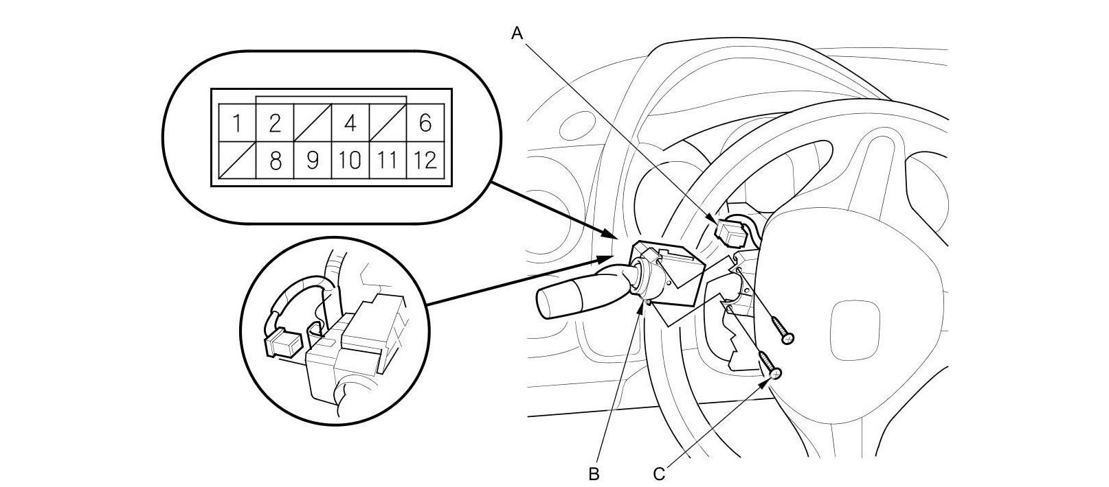 3. Turn the steering wheel to access the combination light switch screws (C).