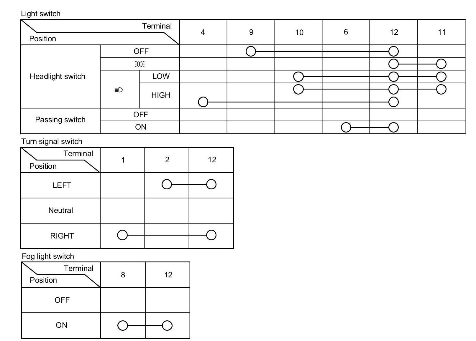 - If the terminals look OK, check for continuity between the terminals in each switch position according to the tables.