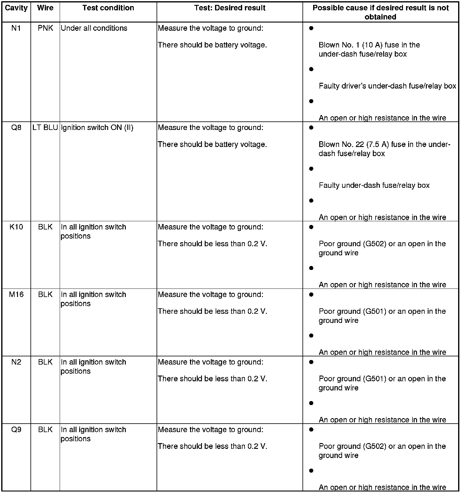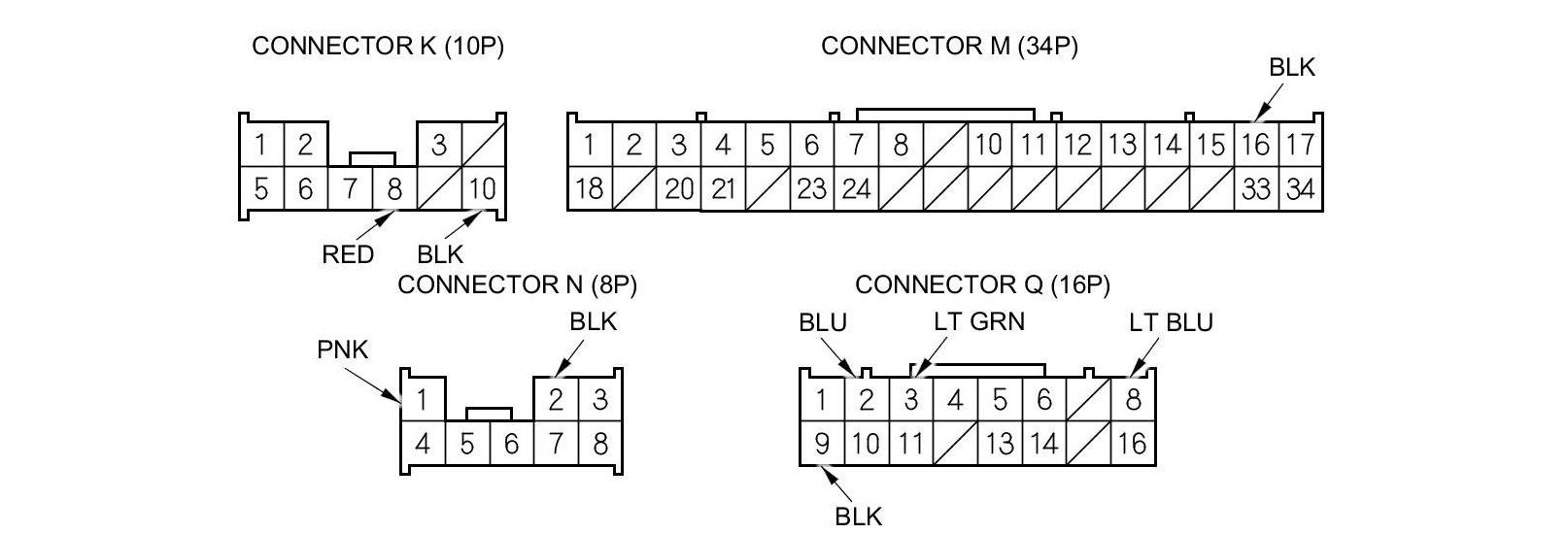 3. Disconnect under-dash fuse/relay box connectors K, M, N, and Q.