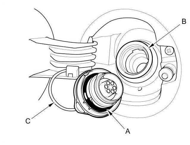 2. Check the fuel fill cap seal (A) and the fuel fill pipe mating surface (B). Make sure the fuel fill cap tether cord (C) is not caught under the cap.