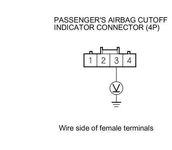 5. Install a jumper wire between passenger's airbag cutoff indicator connector (4P) terminal No. 2 and body ground. The indicator should come on.