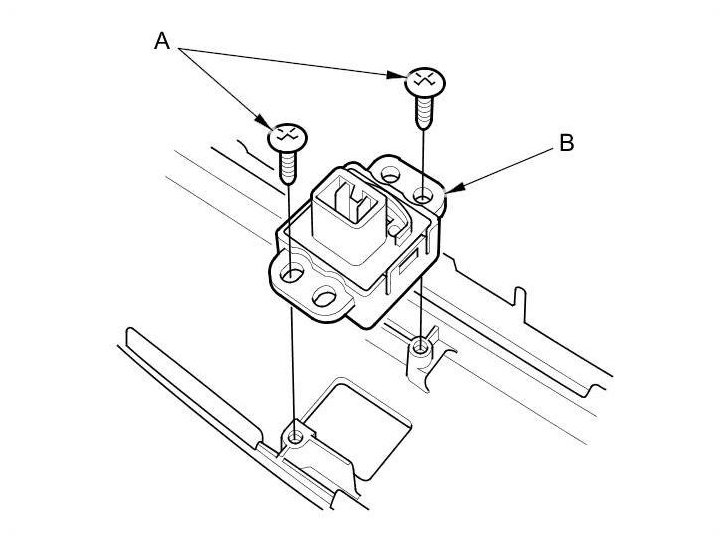 7. Remove the mounting screws (A) and push out the passenger's airbag cutoff indicator (B) from behind the center panel.