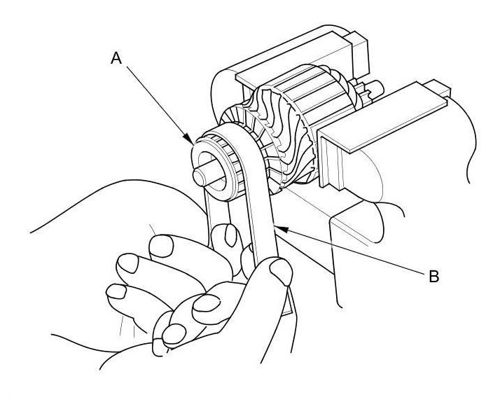 3. Check the commutator (A) surface. If the surface is dirty or burnt, resurface it with an emery cloth or a lathe to the specifications in step 4, or recondition with #500 or #600 sandpaper (B).