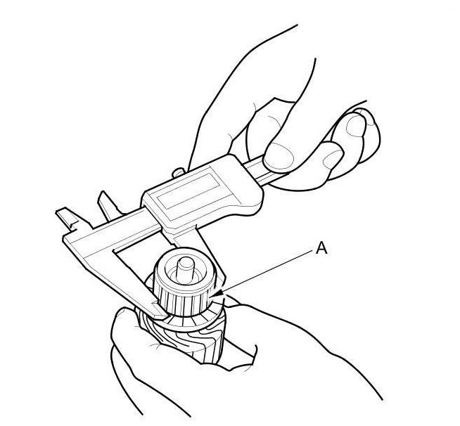 4. Check the commutator (A) diameter with a digital caliper or dial type caliper. If the diameter is below the service limit, replace the armature.