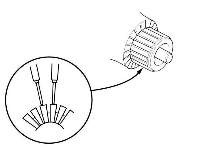7. Use an ohmmeter to check for continuity between the segments of the commutator. If there is an open circuit between any segments, replace the armature.
