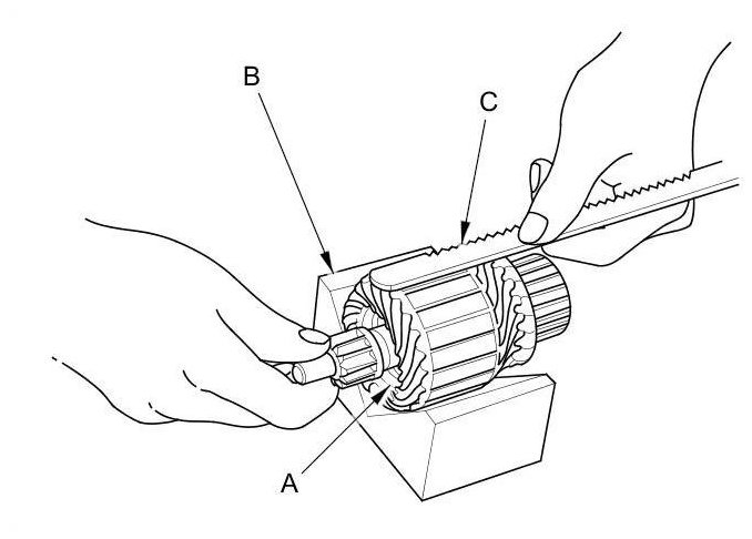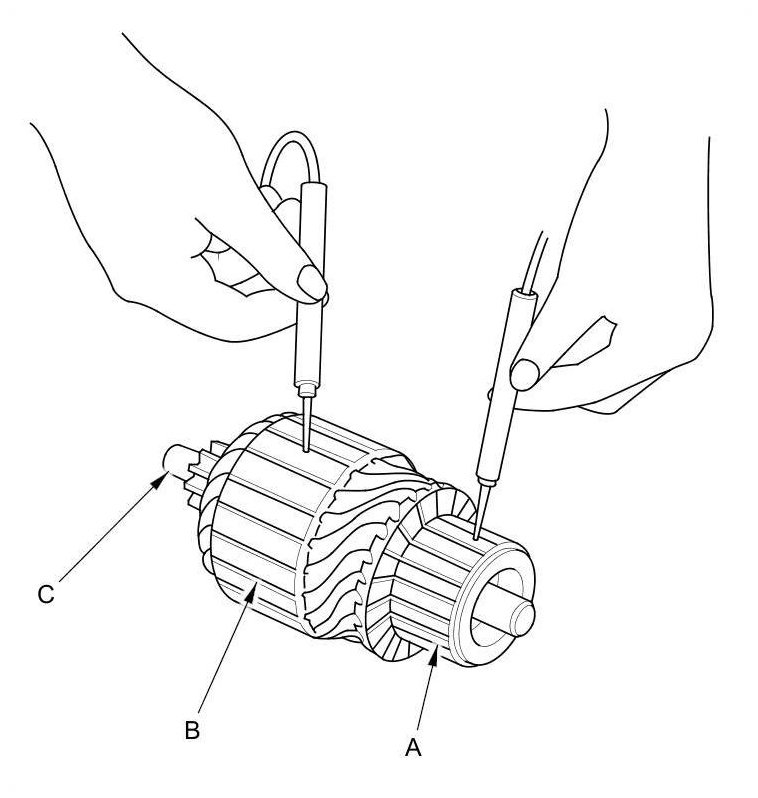 9. Use an ohmmeter to check for continuity between the commutator (A) and the armature coil core (B), and between the commutator and the armature shaft (C). If there is continuity, replace the armature.