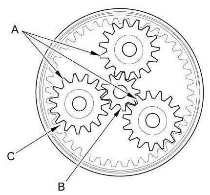18. Check the planetary gears (A), the armature shaft gear (B), and internal ring gear (C). If they are worn or damaged, replace them.